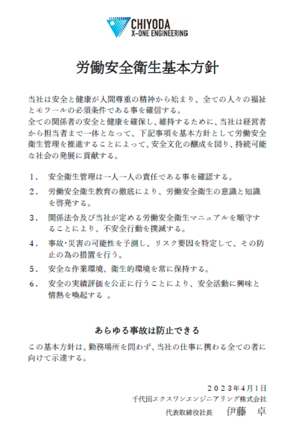 あらゆる事故は防⽌できるこの基本⽅針は、勤務場所を問わず、当社の仕事に携わる全ての者に向けて⽰達する。