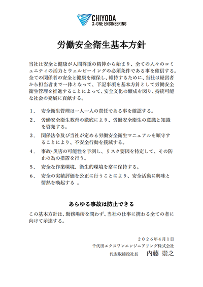 全ての関係者の安全と健康を確保し、維持するために、当社は経営者から担当者まで⼀体となって、下記事項を基本⽅針として労働安全衛⽣管理を推進することによって、安全⽂化の醸成を図り、持続可能な社会の発展に貢献する。