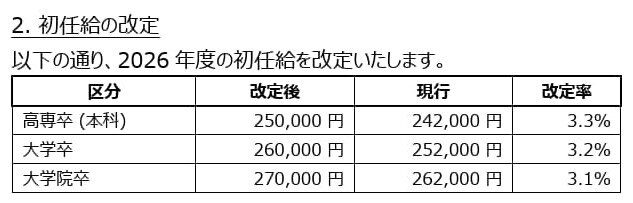 当社は、2030年の目指す姿として中長期経営計画「Beyond Vision 2030」の実現に向け、人的資本への積極的な投資の一環として、物価上昇と従業員一人ひとりの貢献に報いるべく、全従業員(60 歳以上の継続雇用者ならびに 65 歳以上のシニアプロフェッショナル社員を含む)を対象に、3年連続の賃金引上げ、並びに初任給の改定(以下プレスリリース抜粋)を実施しました。